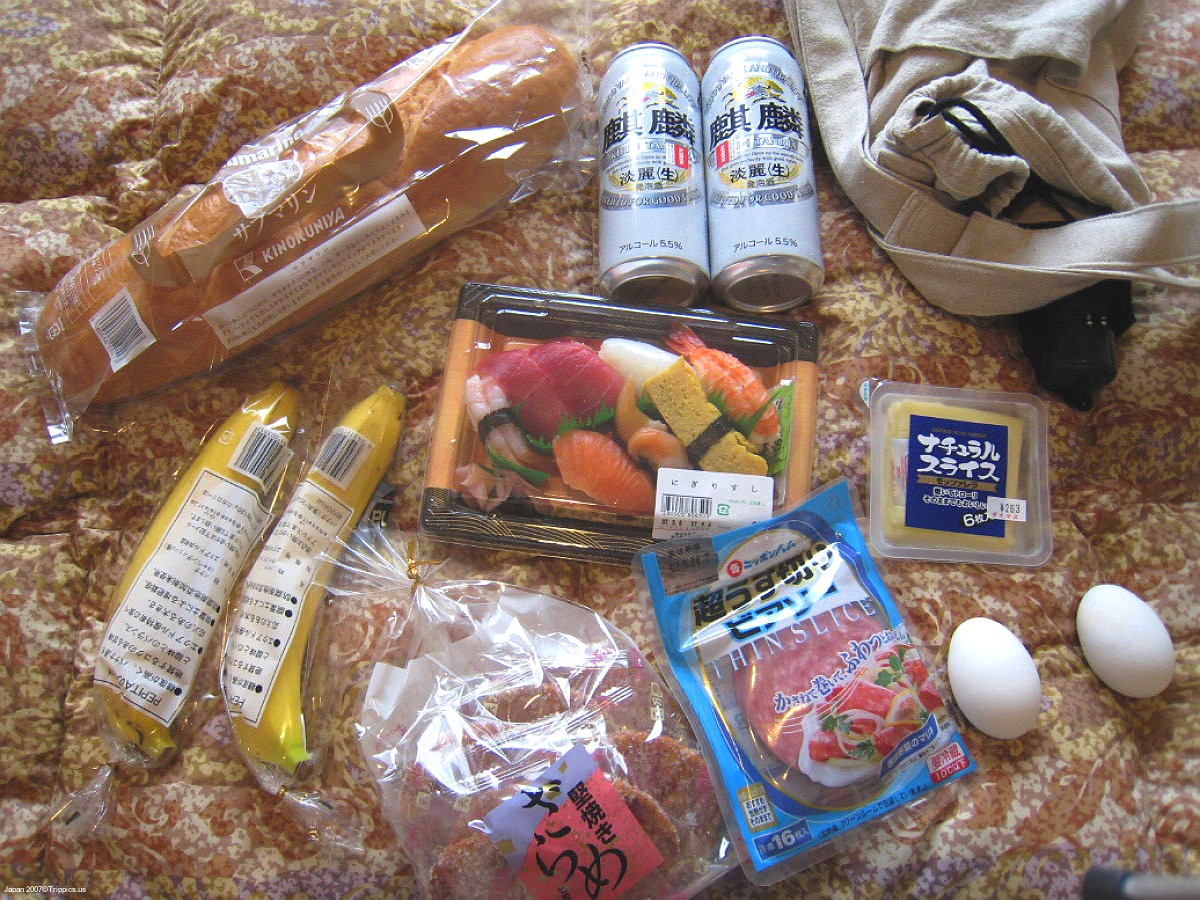 13 I bought sushi for dinner, bananas, eggs, lunch meat, bread and of course beer. If you can stop by a store every few days you can save money.